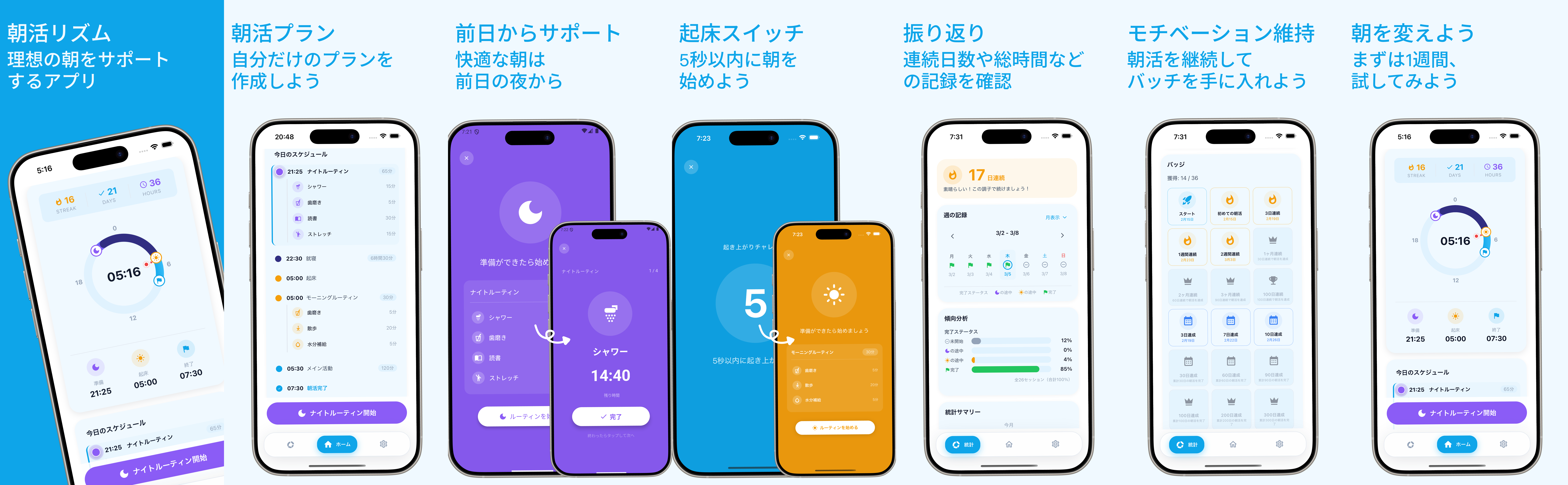 「明日こそ早起きしよう」そう思って寝て、起きれない毎日を繰り返していませんか? 朝活リズムは前夜のルーティンから朝活完了までをトータルでサポートするアプリです。逆算プランニングで「何時に寝ればいいんだろう?」と悩むことはもうありません。